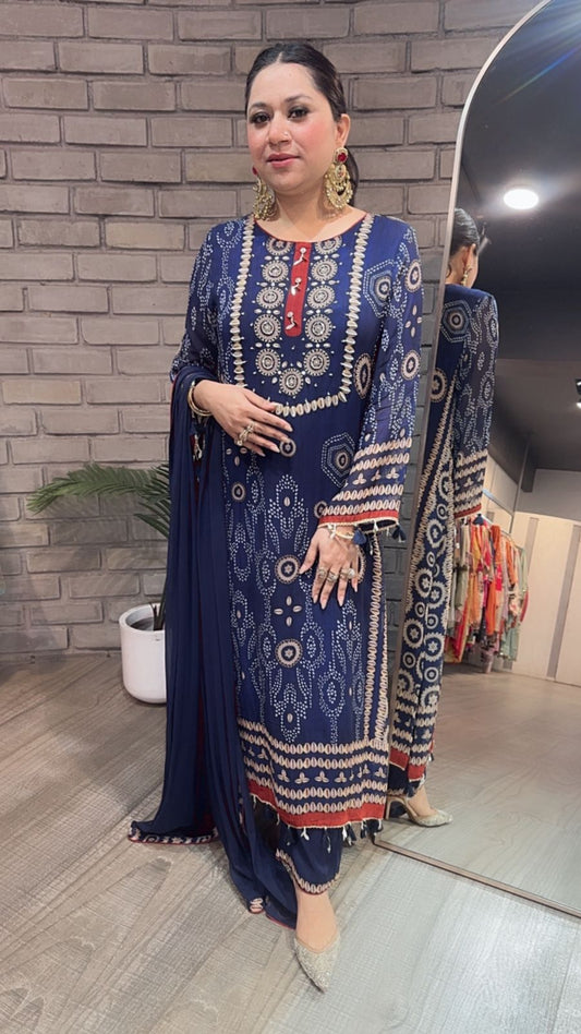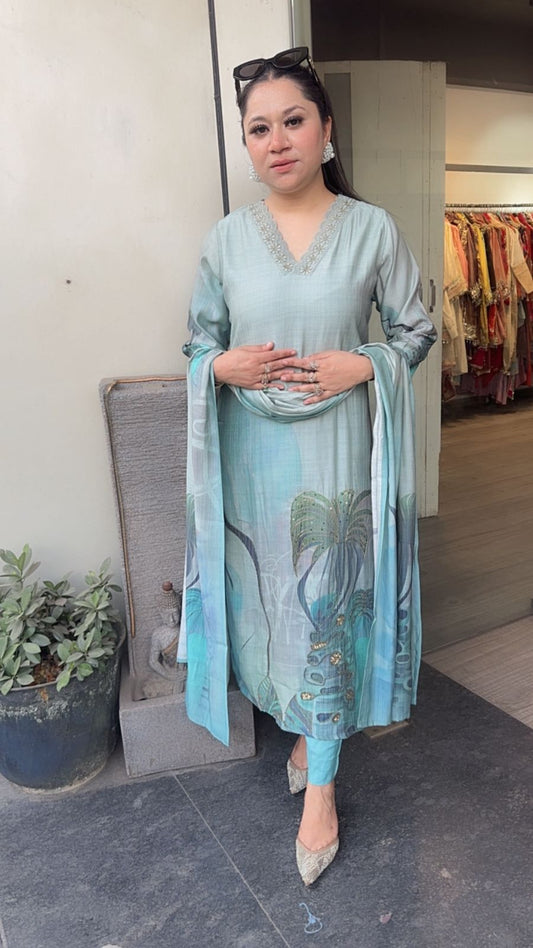 Sold outTeal blue Digital print suit 3pc