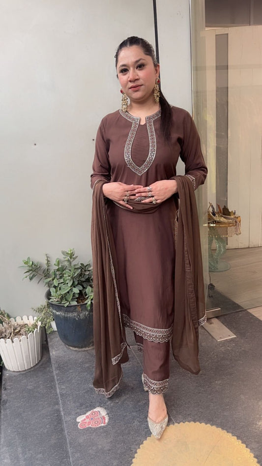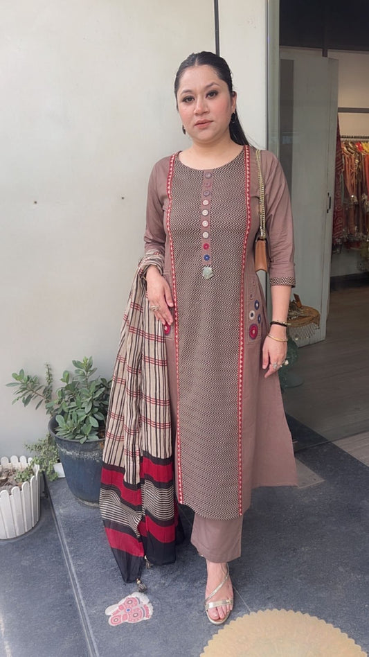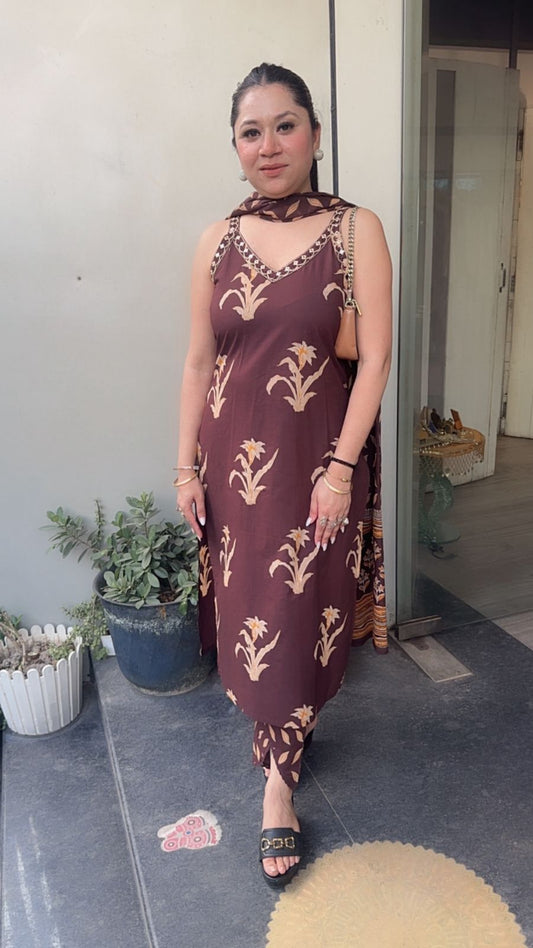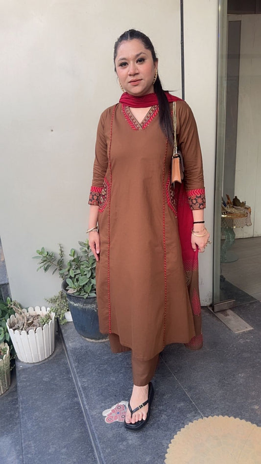 Dahi Brown Designer Cotton Suit (Sleeve Fabric Attached)