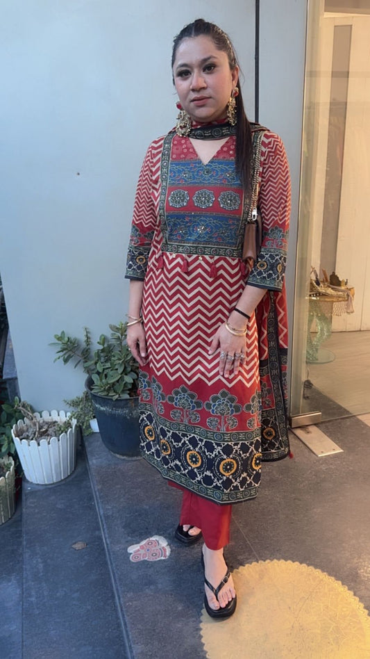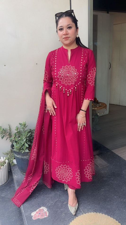 Elaichi Cherry Red Cotton Anarkali Designer Cotton Suit