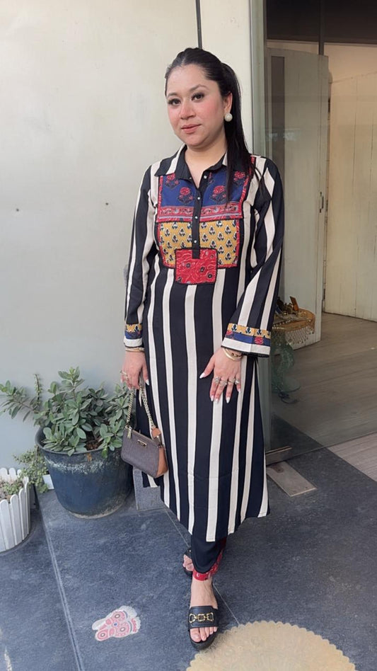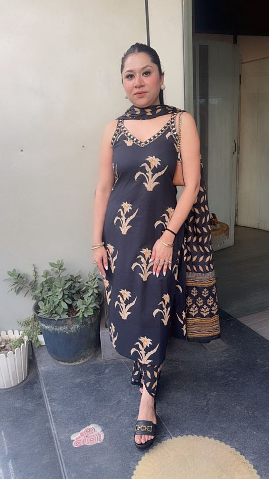 Dahi Black Designer Cotton Suit (Sleeve Fabric Attached)