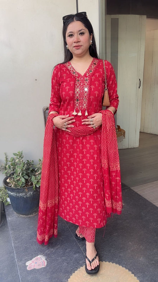 Ekam Ivory Red Digital Dupatta Cotton Suit