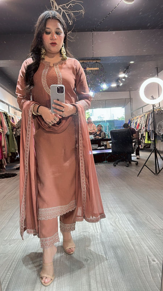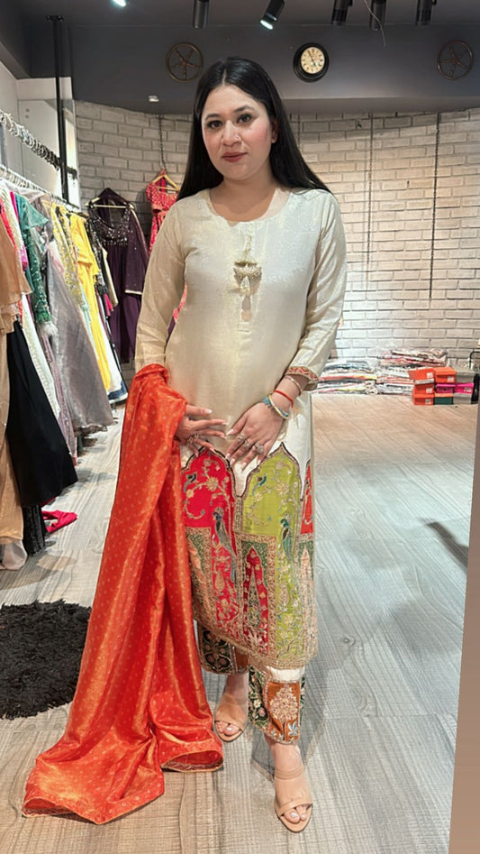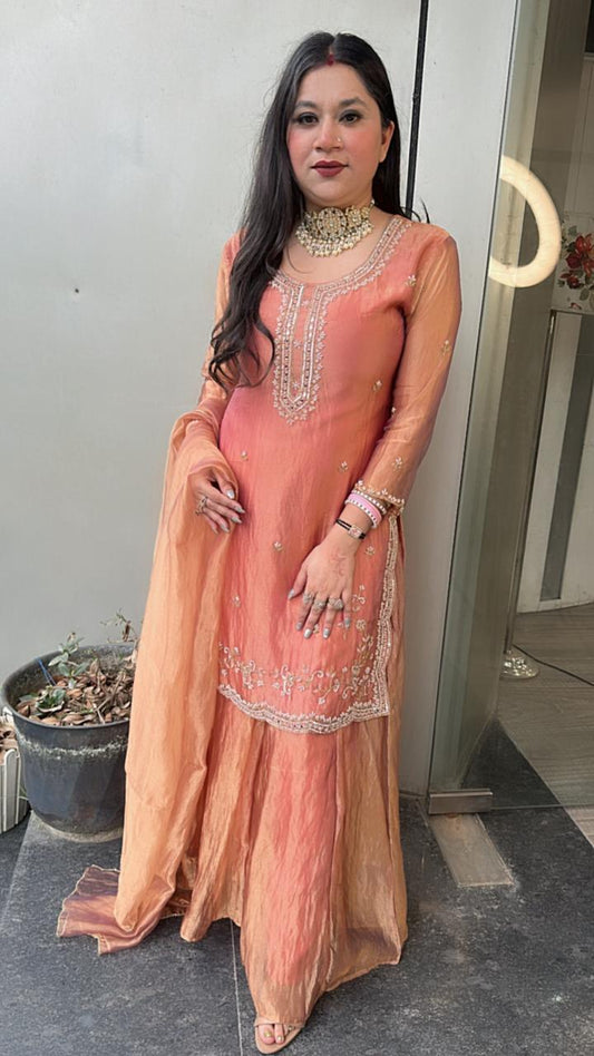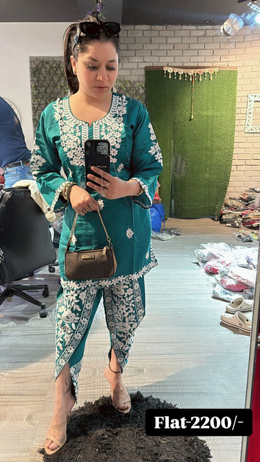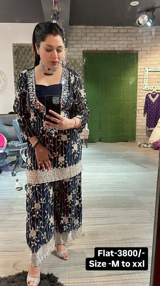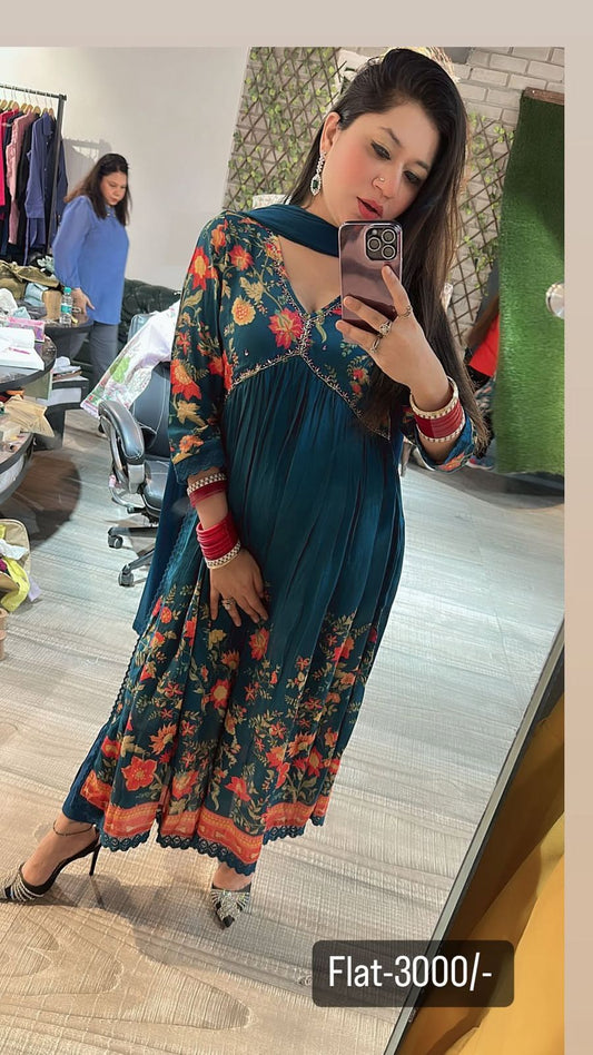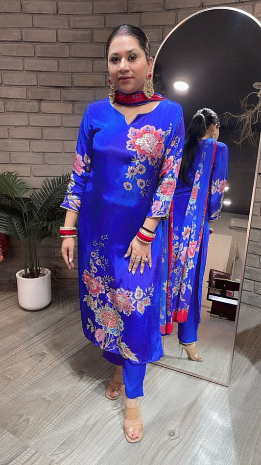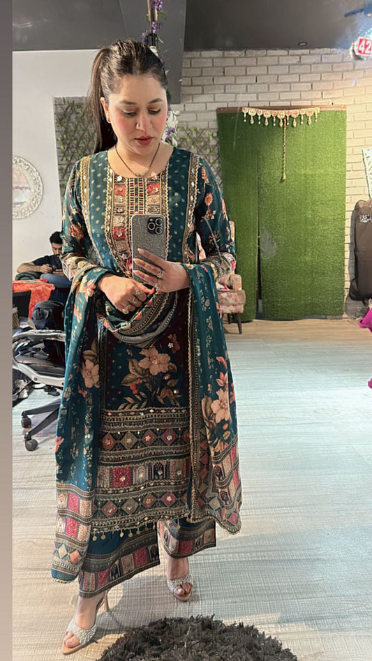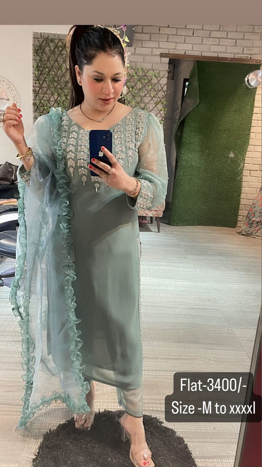 Teal Blue Embroidered katdana organza sleeves design suit 3pc