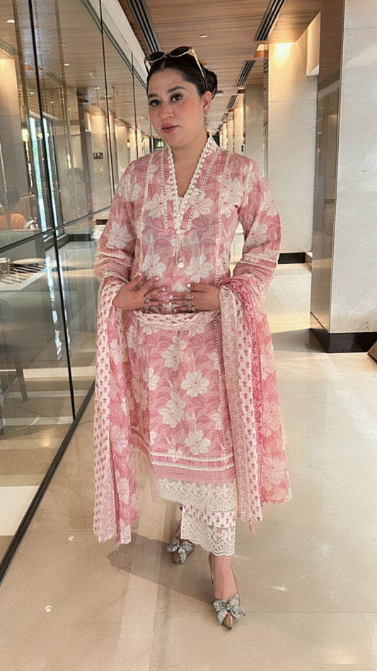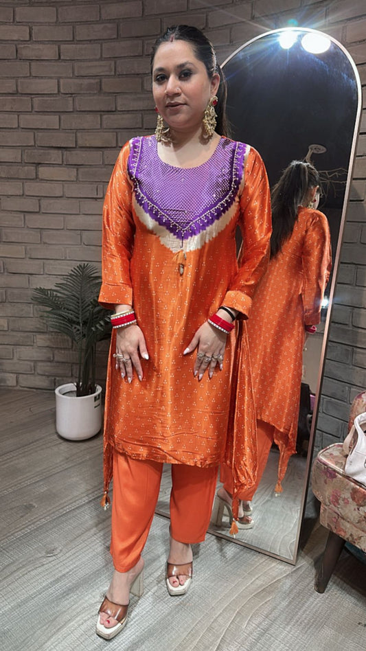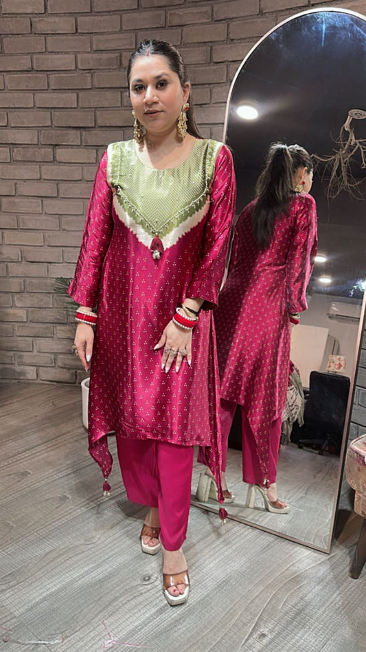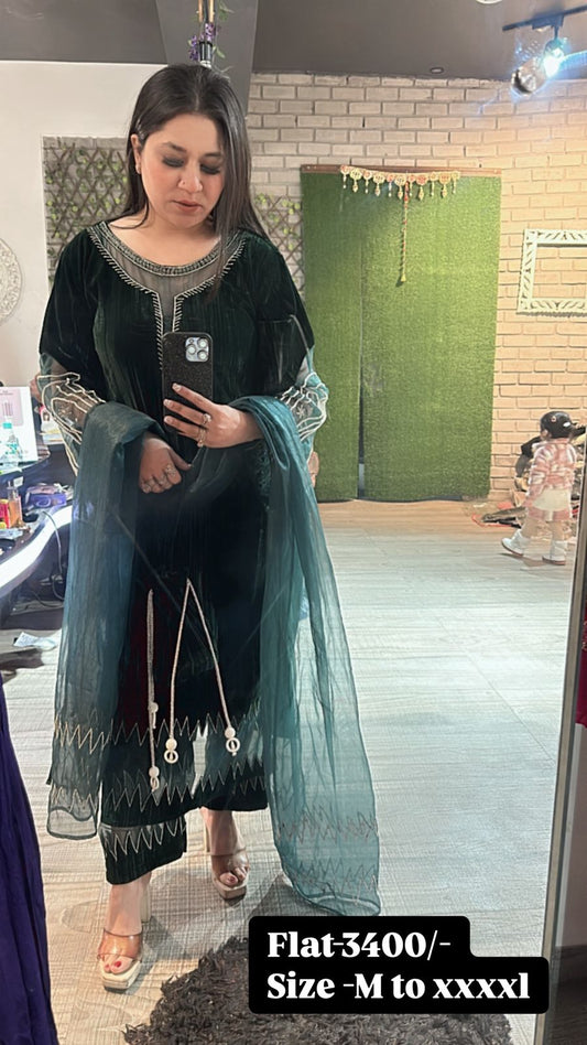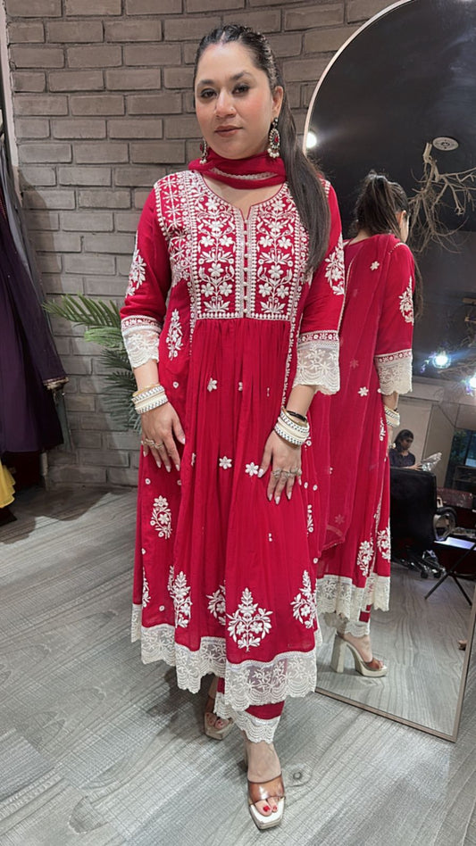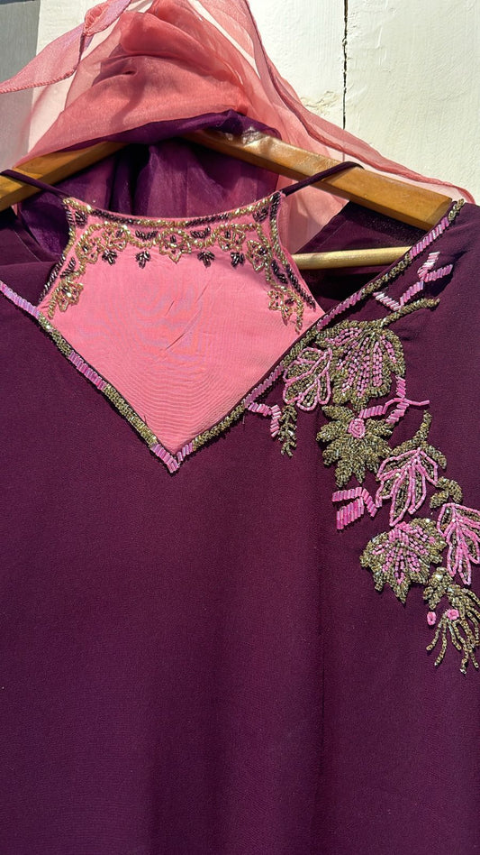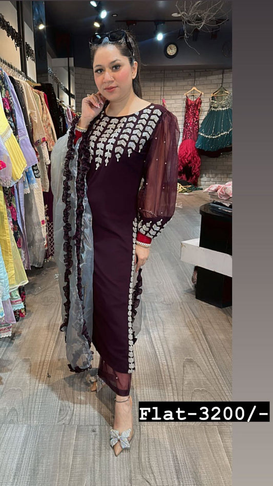 Wine Embroidered katdana organza sleeves design suit 3pc