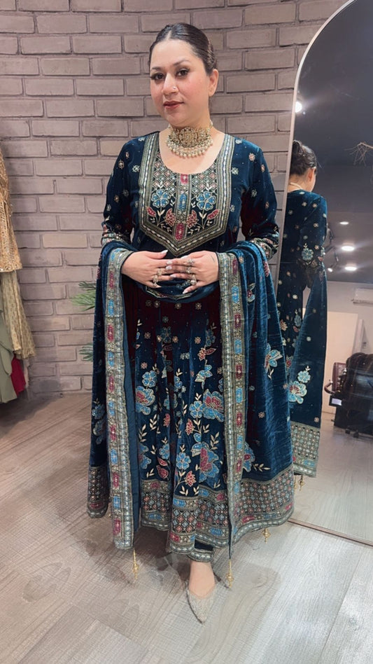 Inoor Teal Blue Floral Emboss Velvet Anarkali