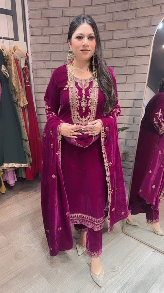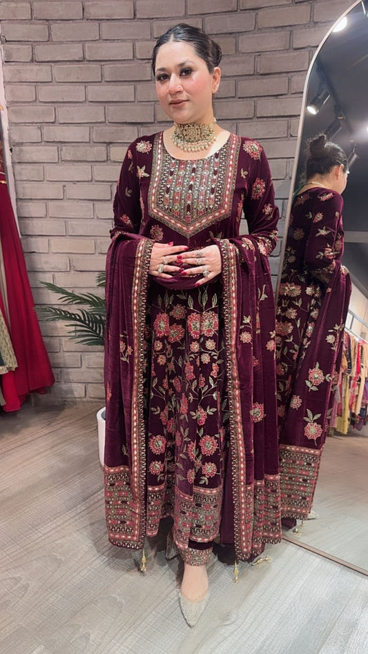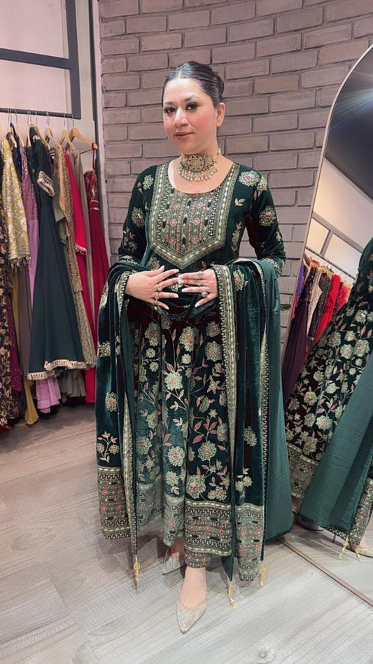 Mannat Bottel Green Floral Emboss Velvet Anarkali