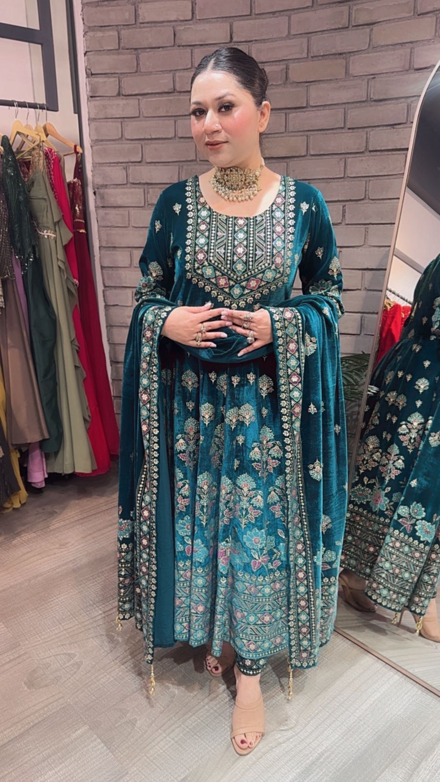 Lodhi Teal Blue Floral Emboss Velvet Anarkali